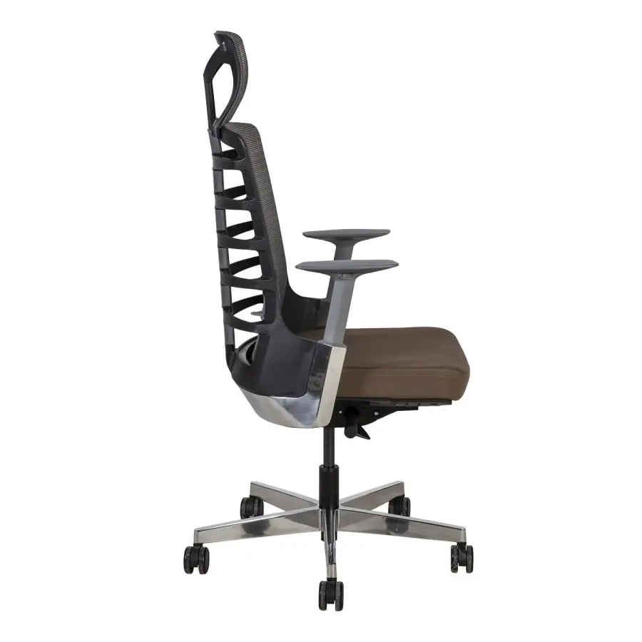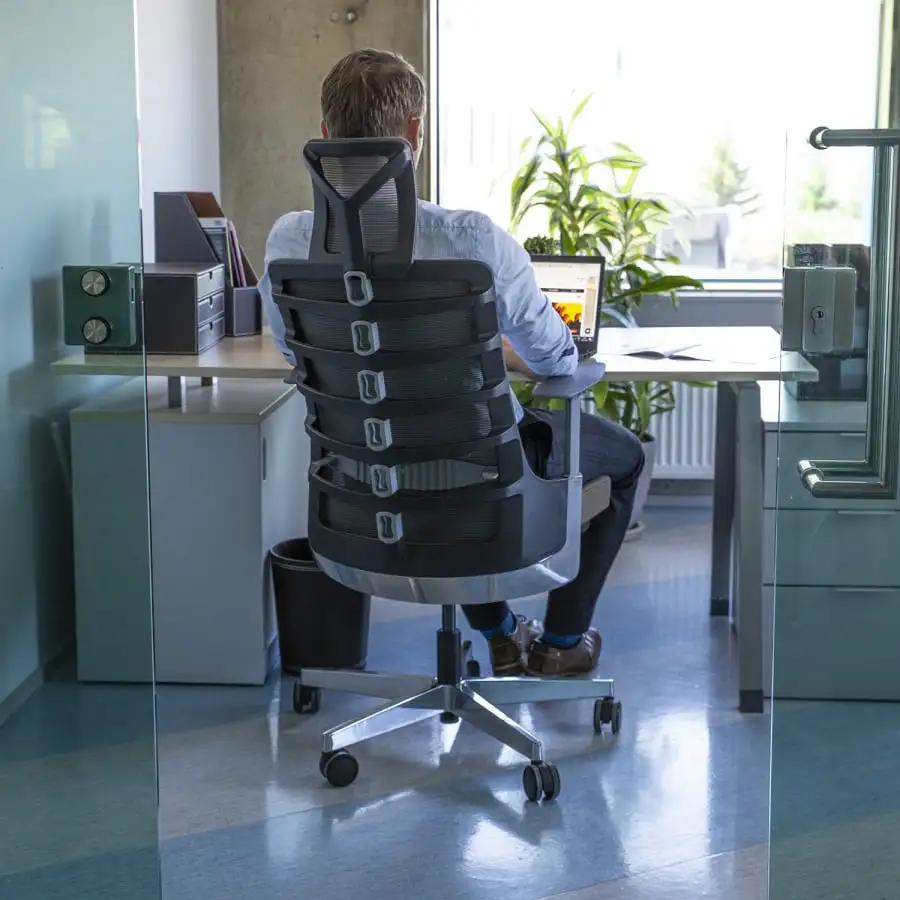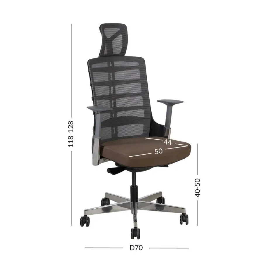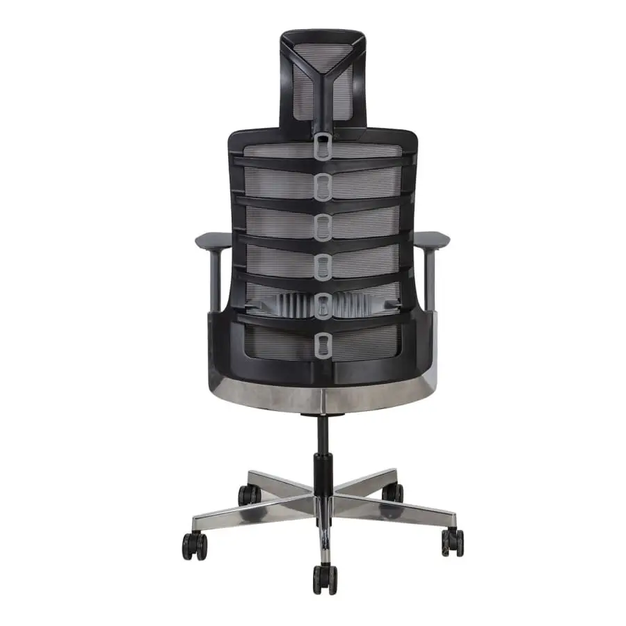 Office chair Spinelly. A unique model with a flexible backrest and weight-operated mechanism. Seat surface material: polyester fabric, 50,000 Martindale. Back and neck support upholstered with polyester mesh fabric. The body of the backrest is made of black polypropylene plastic. There are elastomeric joints between the parts of the backrest, which guarantee the flexibility of the backrest. The lumbar support of the backrest is adjustable by 55 mm. Mechanism and adjustments: the weight-operated mechanism adjusts the stiffness of the swing according to the weight of the sitter. Seat depth adjustable 44-50cm, seat height adjustable with gas spring. The gray plastic armrests are supported by fiberglass filling. Comfortable polyurethane support surfaces. Armrest height adjustable 17.5-28cm. 5-pronged aluminum crossbar D69.5cm, 65mm spoked wheels.