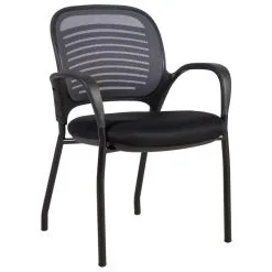 The Torino metal frame customer chair seat is upholstered in durable polyester mesh fabric, 30,000 Martindale. Armrests made of plastic. The chairs are stackable.