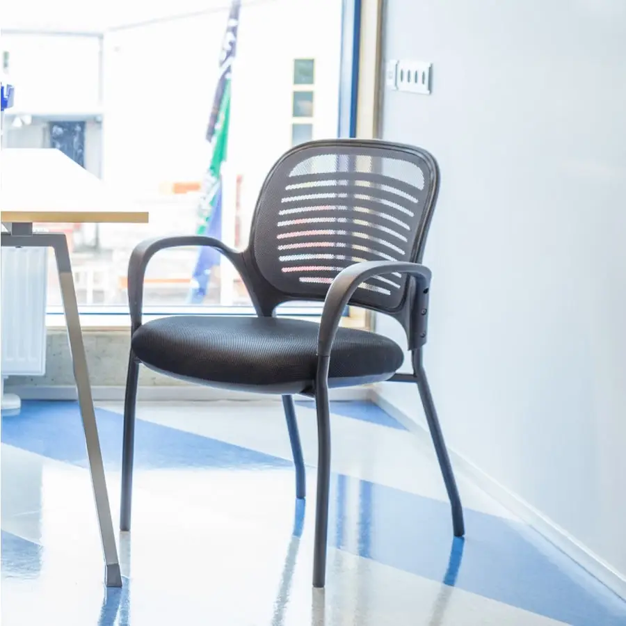 Kundstolsstolen Torino metallram är klädd i slitstarkt polyesternät, 30 000 Martindale. Armstöd av plast. Stolarna är stapelbara.