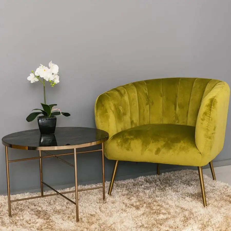 The Tucker armchair is an eye-catcher in your living room! A beautifully designed, velvety armchair invites you to sit down. The look of the armchair is completed by the beautiful gold-colored steel legs.