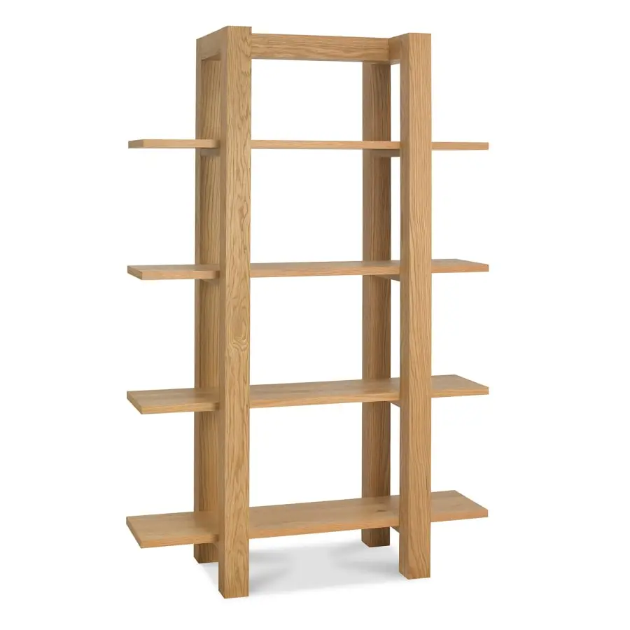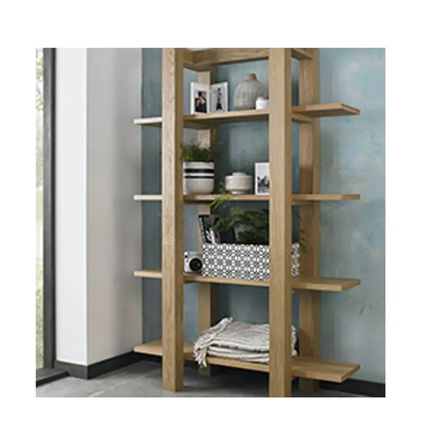 Snygg öppen hylla Turin, som rymmer många inredningsföremål utställda. Tillverkad av ek och avslutad med olja. Finns i traditionell ekfärg eller nyans av rökt ek.