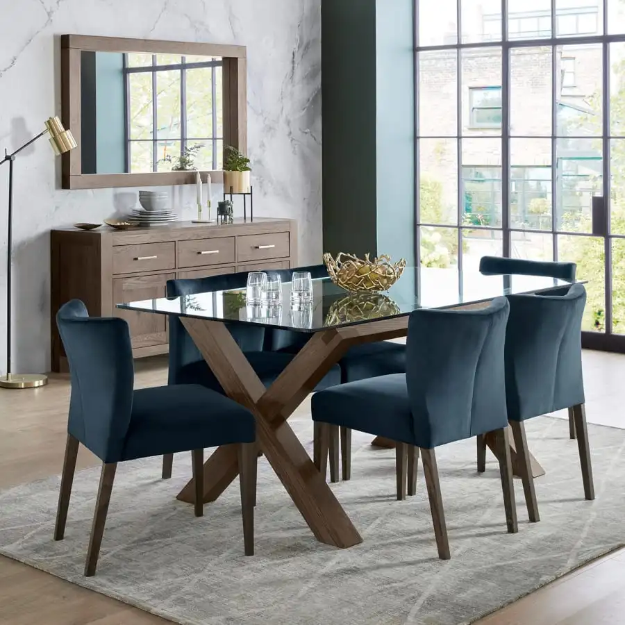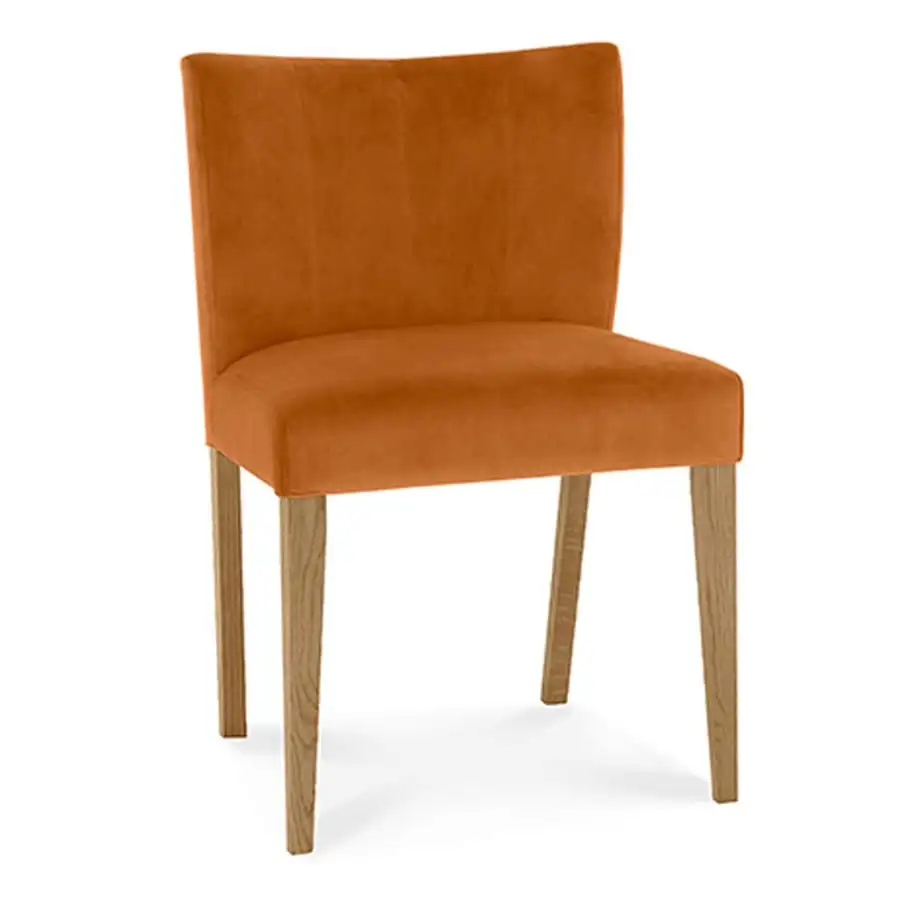 Dining chair Turin brings a fresh look to the interior! The beautiful color options give you plenty of choice. Elegantly designed backrest and upholstered with soft velvet fabric. The chairs have either light oak legs or smoked oak legs.