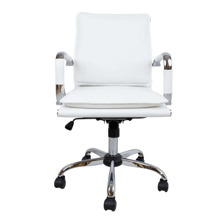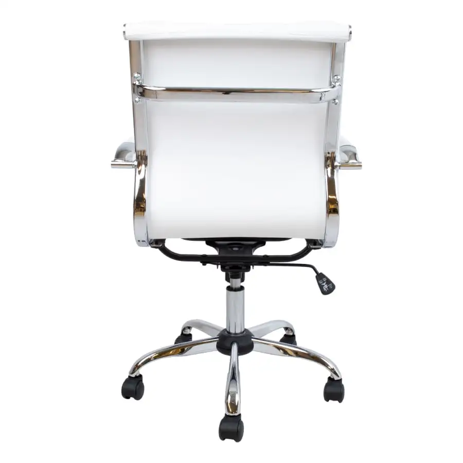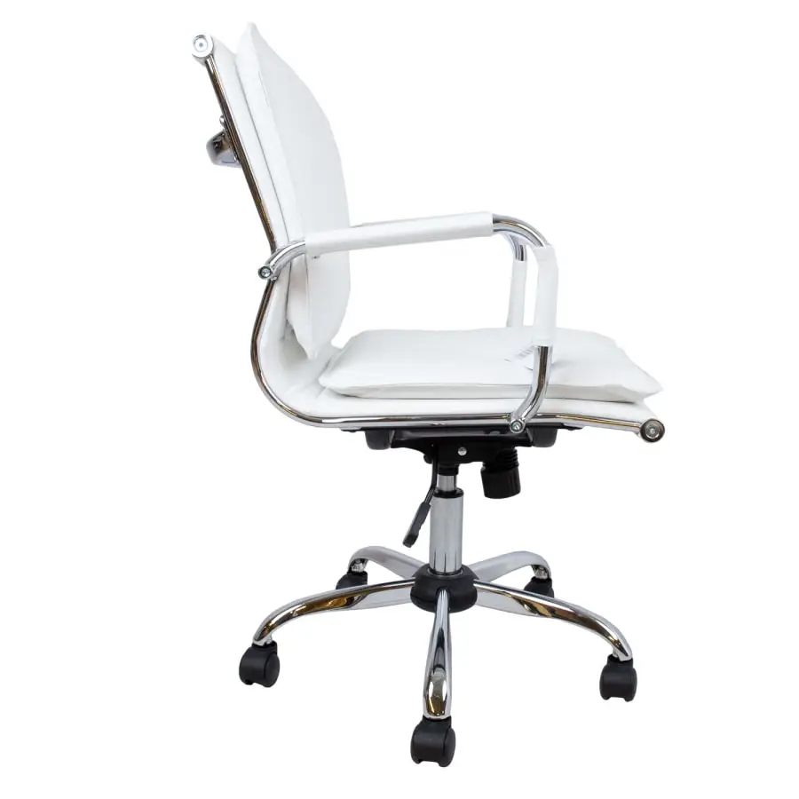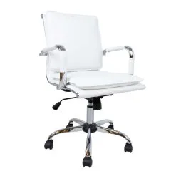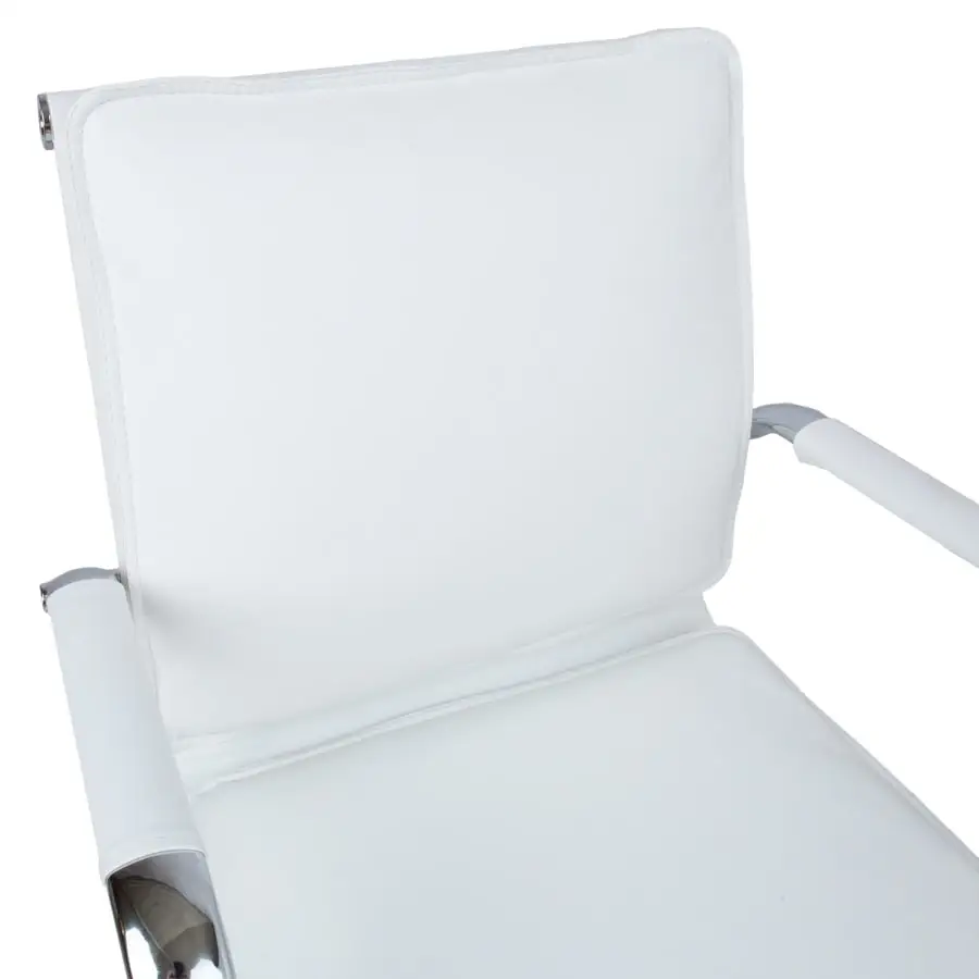 Surface material: white artificial leather. Body color: chrome. Mechanism and adjustments: swing mechanism, seat height adjustable with gas spring. Armrests: chrome-plated, padded with artificial leather. Leg grid: chromed steel grid, R30cm. Wheels: plastic wheels, pin: 11mm. Dimensions: height 93-103cm, seat depth 47cm, seat width 48cm.