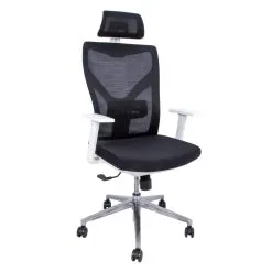 The seat is covered with polyester fabric, 50,000 Martindale. Back and neck support are covered with polyester mesh fabric, 30,000 Martindale. The chair has a tilting mechanism, lockable in one position. Adjustable lumbar support. Pneumatic seat height adjustment. The body and the body of the backrest are made of white plastic. The armrests are fixed. The height and angle of the headrest is adjustable. 5-prong aluminum stand, R34cm. Nylon wheels, 50mm. Height 94-100.5cm, seat width 49cm, depth 48cm, seat height 45-54cm.