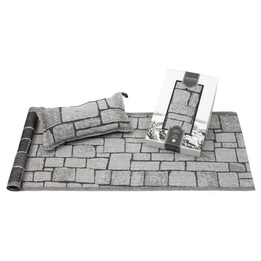 The set includes a black Kivetys tablecloth and a Kivetys pillow. The tablecloth is 45×160 cm, the sauna pillow 22×40 cm. Composition 50% linen and 50% cotton.