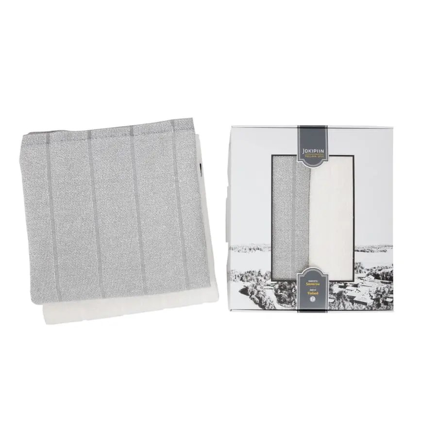 Setet innehåller två Laituri badlakan, en vit och den andra vit/grå. Handdukarna är 75×150 cm stora. Sammansättning 50% lin och 50% bomull.