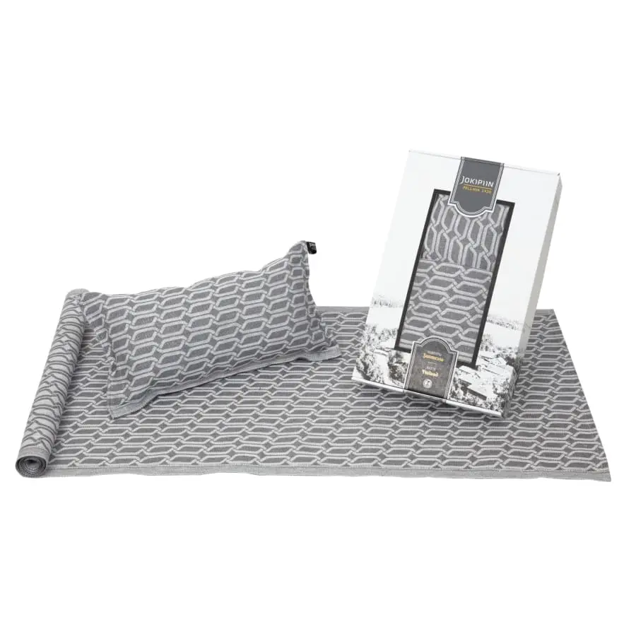 Setet innehåller en grå Linkki-duk och en Linkki-kudde. Duken är 45×160 cm, bastukudden 22×40 cm. Sammansättning 50% lin och 50% bomull.