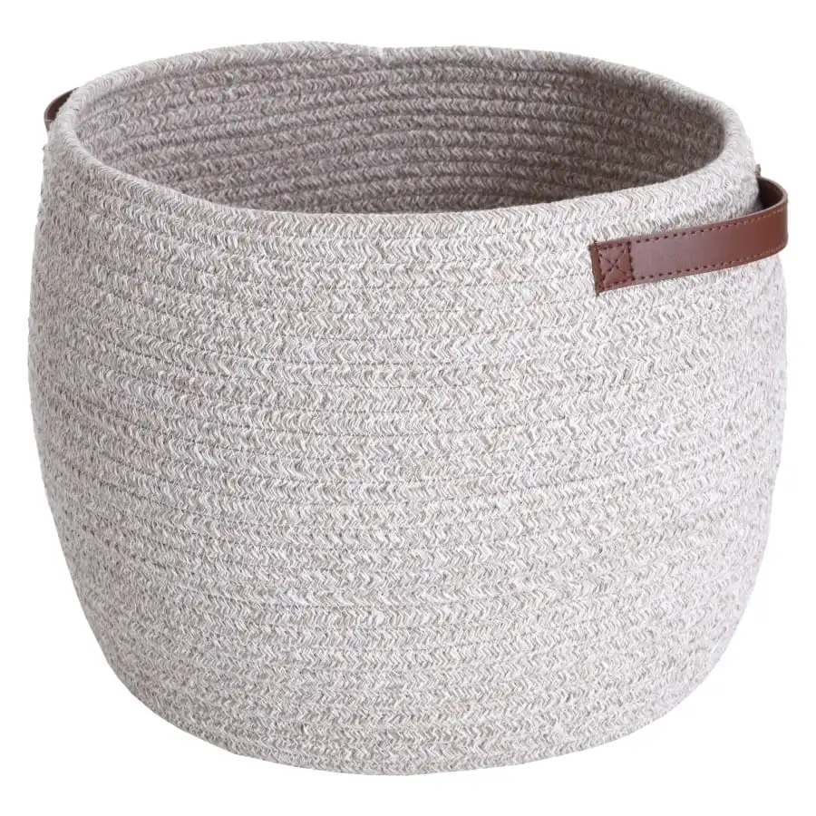 Luhta Homes Kaivo interiörkorg är 100 % bomull. Den enkelt snygga korgen har läderhandtag.
