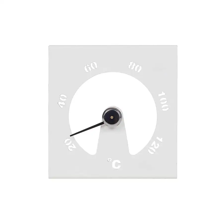 Stylish and modern sauna meter. Scale 20-120 degrees. The material is painted aluminum. Size 14.5 x 15 x 3.5 mm.