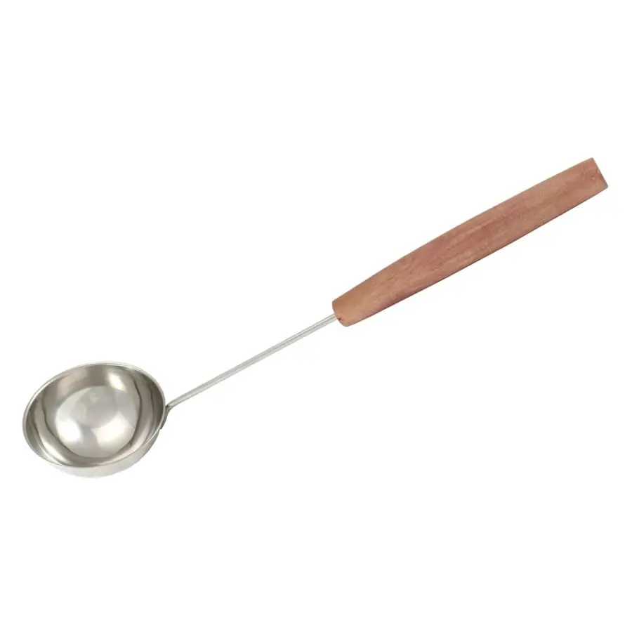 En modern slev med rött behandlat bokhandtag. Högkvalitativt polerat rostfritt stål. Längd 44 cm, hinkvolym 3 dl.