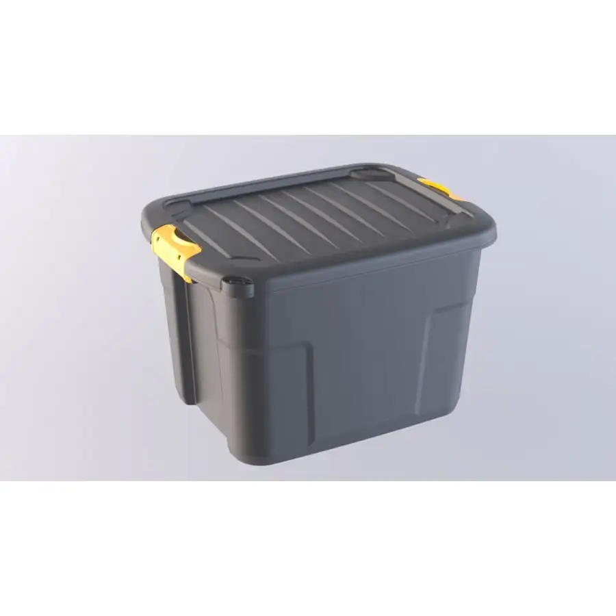 The very sturdy Mano storage box with a lid has a volume of 42 liters. Color black. The ends of the box have yellow lid fasteners. There is a hole in one corner of the box so that the lid can be locked separately with a padlock if necessary. The box is very easy to carry and stackable.