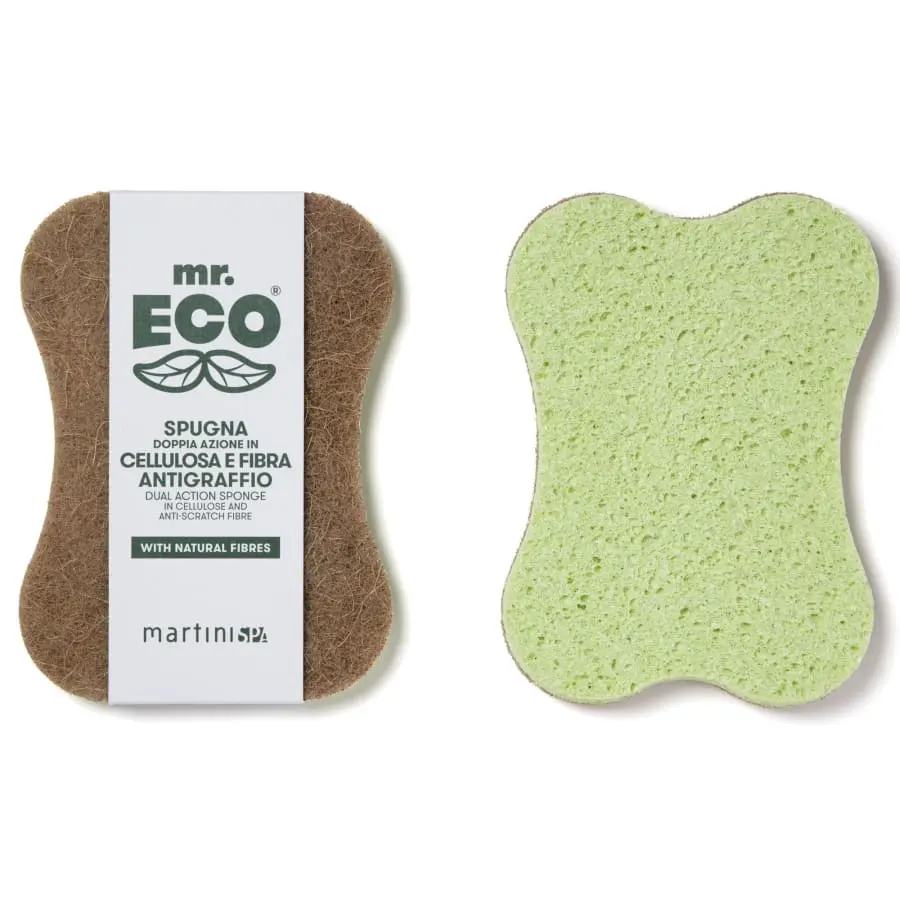 MrEco Dual action sponge in cellulose and non-scratch fibre of plant origin and non-scratch fibre with recycled Sisal and PET. The plant-origin cellulose side is super absorbent. Ideal for cleaning gently, while the non-scratch fibre side thoroughly cleans the most encrusted surfaces. Multi-purpose. Ideal for kitchen and bathroom.
