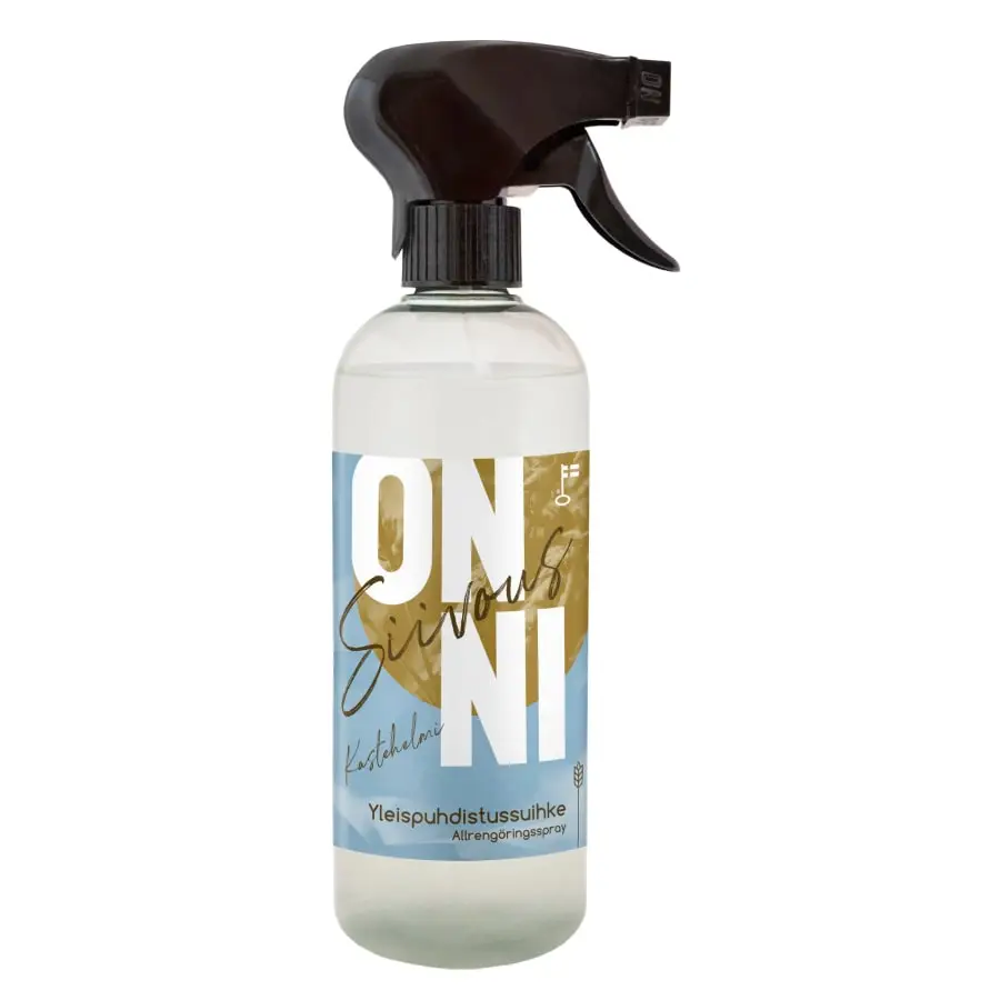 Finnish all-purpose cleaning spray that has a fresh and clean scent. pH is neutral so it is suitable for almost all surfaces. The washing efficiency of ONNI cleaning sprays is based on natural wheat-based surfactant, which is obtained as a by-product of the food industry. Cleaning with the ready-to-use ONNI cleaning spray is very easy. Biodegradable products are free from animal-derived raw materials, and the bottle is made of 100% recycled plastic.