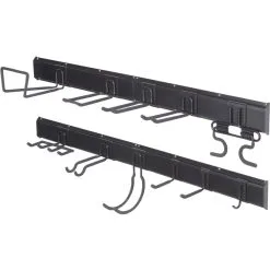 Två 61 cm långa skenor som kan fästas i varandra eller separat. I setet ingår 13 olika krokar som kan placeras på skenan efter önskemål. Total belastning max 100 kg / skena, 20 kg för en krok. GS accepterade. Material: stål. Svart färg.