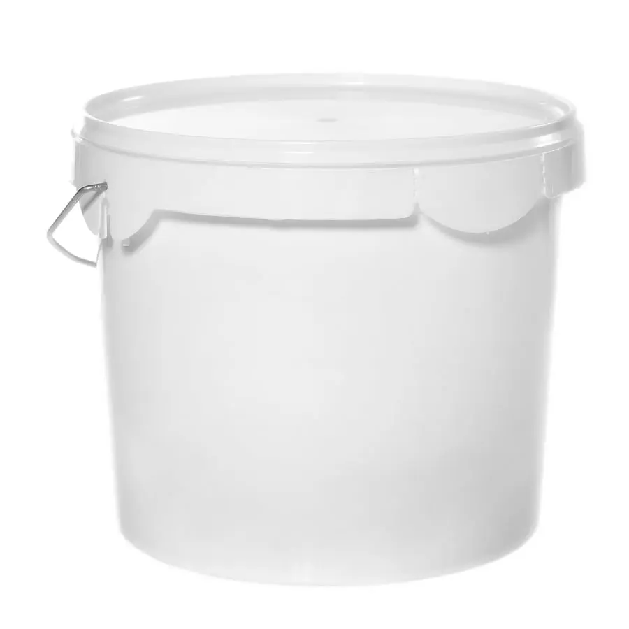Plastopak 5 liter white storage bucket with lid. A metal headband on the handle. The food is suitable for use and dishwasher safe.