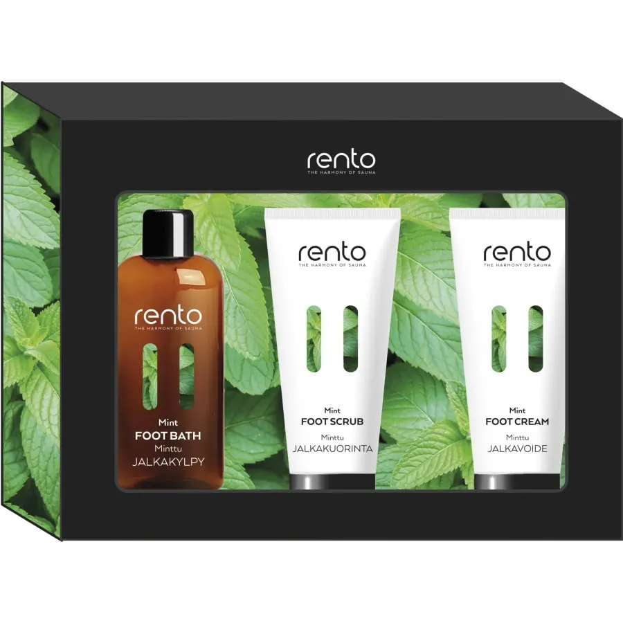 Contains: Foot Bath 200 ml, Foot Scrub 100 ml and Foot Cream 100 ml. Scents: mint and eucalyptus.