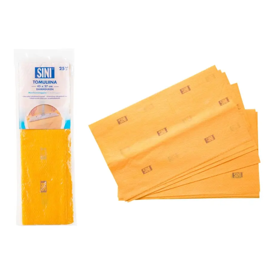En dammduk fuktad med vårdolja binder även det finaste damm och små skräp och lämnar en vacker glans på golvet. Det är också en utmärkt hjälp i familjer med allergier. Dammduk är lämplig för alla golvytor. Den kan även användas för att torka av damm från möbler, men inte från speglar eller andra glasytor. Blöt inte en oljad dammduk.