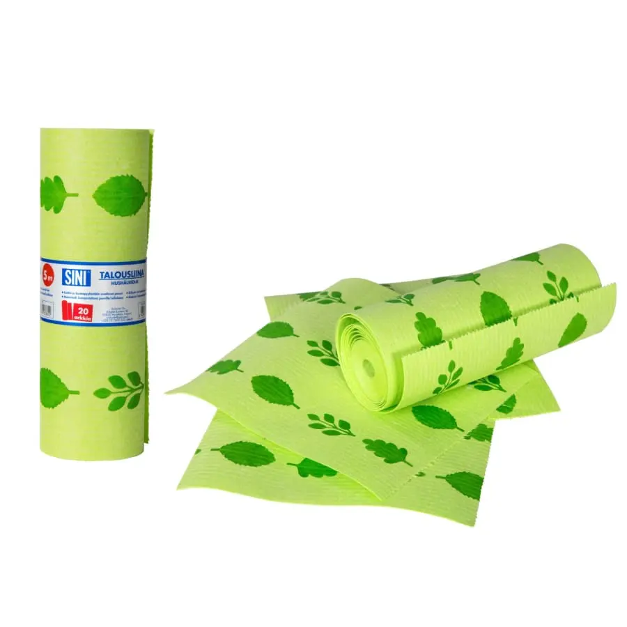 SINI Hushållshandduksrulle är gjord av bomull och cellulosa. Den är mycket slitstark, absorberande, mjuk att använda och lätt att hålla ren och fräsch. Duken passar till kök, badrum och andra ställen där det finns fukttåliga ytor. Den flexibla och mjuka trasan kan även diskas ihoprullad i diskmaskinens bestickhållare. Hushållsduken kan kasseras genom kompostering.