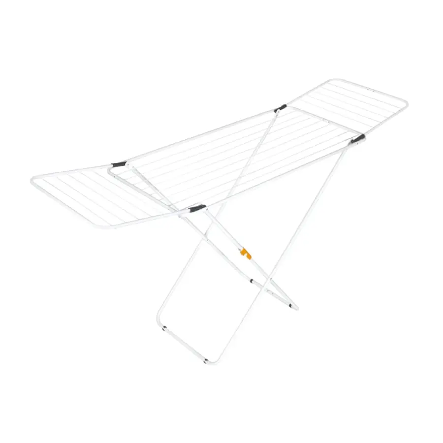 Det robusta torkstället Lenni har två låssystem. Den patenterade lösningen låser vingarna när stativet är ihopfällt, vilket ökar komforten och säkerheten. Flikarna öppnas inte för fingrar eller fötter, men flikarna förblir faktiskt stängda, och klädstället är lätt att förvara. När stativet är öppet kan benen låsas stängt så att Lenni står stadigt upprätt när den används. Hängutrymme 18 meter.