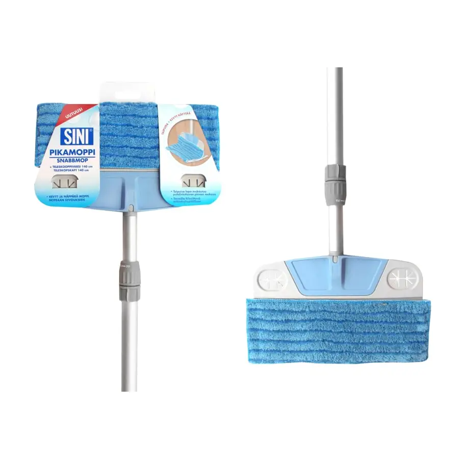 Snabbmoppen är en lätt och behändig mopp för snabb rengöring. Mopphandtaget anpassar sig väl till ytan som ska rengöras. Mikrofiberöverdraget är fäst med snabbmoppande klistermärken, så det kan användas antingen torrt eller vått eller vått. Med hjälp av en snabbmopp är det enkelt att rengöra golvlister, tak samt golv. Den lätta moppen är lätt att hantera. Moppen har en teleskoparm som kan justeras till önskad längd.