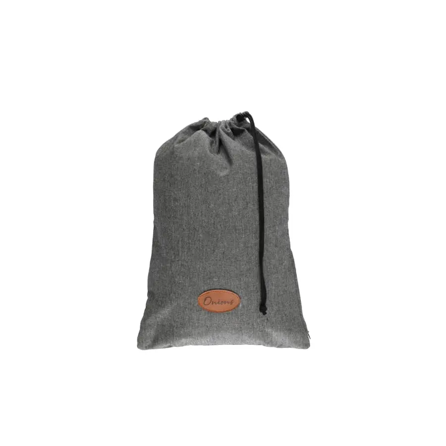 A stylish bag for storing onions. Made of recycled material. Material recycled cotton 90%, polyester 10%. Wash at 40 degrees.