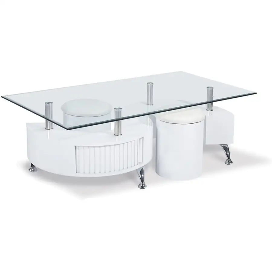 Chrome legs and glass cover fixing leg chrome. The coffee table includes two small stools.