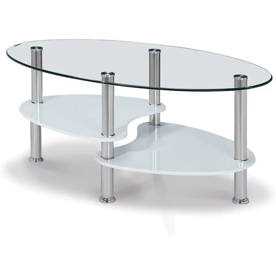 Glass-topped oval-shaped coffee table. Magazine shelves in 2 different levels, painted white mdf board (High Gloss). Body chromed metal.
