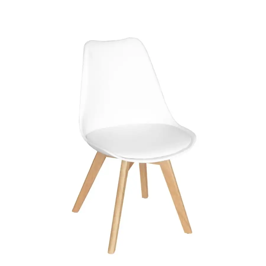 Istuinosat muottiin valettua vahvaa muovia. Istuimessa vaahtomuovipehmuste.Valkoinen keinonahkaverhoilu . Tammijalat. Toimitus osina, helppo kasata.