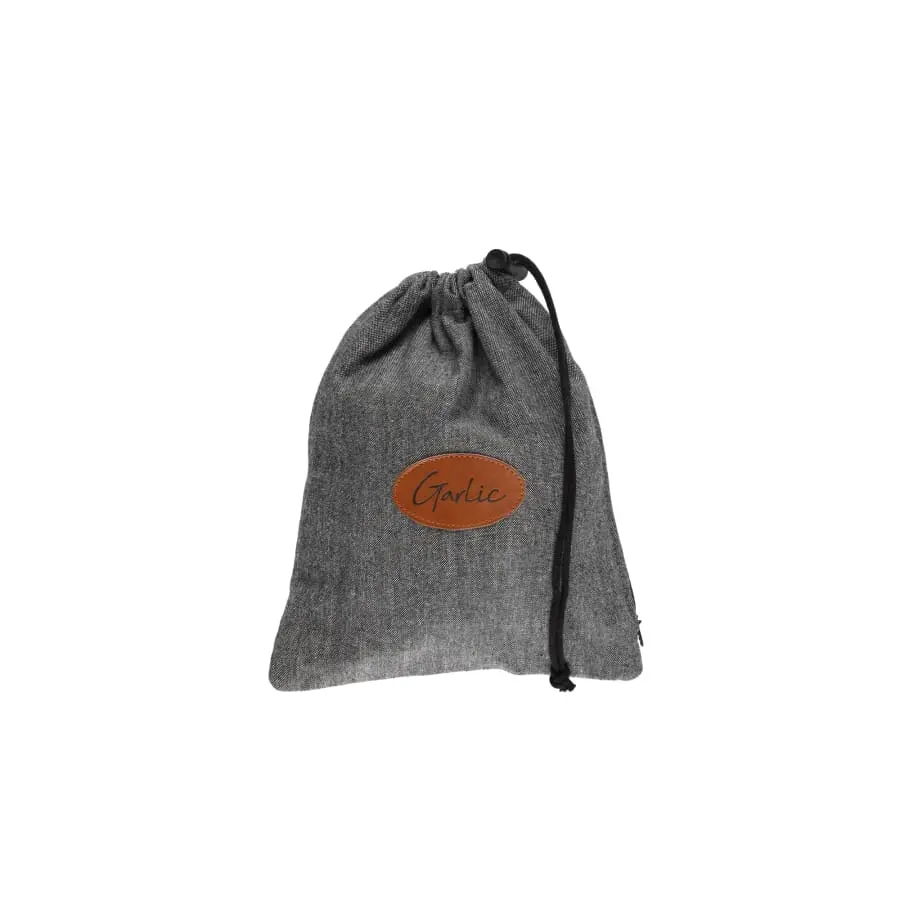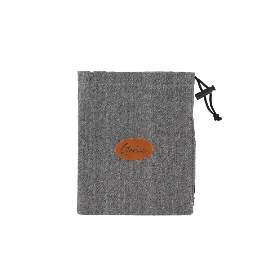 A stylish bag for storing garlic. Made of recycled material. Material recycled cotton 90%, polyester 10%. Wash at 40 degrees.