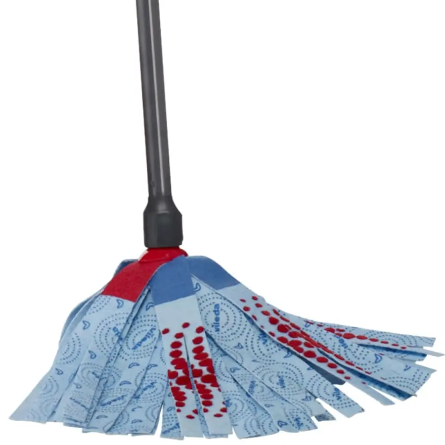 Vileda SuperMocio 3Action XL-sized strip mop with three different power zones: Red stain remover for stubborn stains, dark blue 100% microfiber surface for removing greasy dirt and 3D red dot power zone picks up hair and loose dirt.