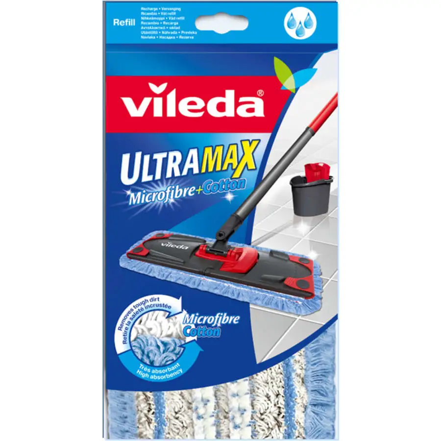 Ersättningsmoppe av mikrofiber + bomull för Vileda UltraMax plattramsmopp. Lämplig för fuktig och våt rengöring av vattentäta material, klinker och plastmatta. Ersättningsmoppen är gjord av mikrofiber, som lätt rengör envis smuts, och mycket absorberande bomull. Moppens öglor samlar damm och smuts. Ersättningsmoppen UltraMax Microfibre&Cotto är lämplig för Vileda UltraMax arkramsmoppen och Vileda 1-2 Spray färdig att använda moppen. Maskintvätt: 60°C, ingen sköljmedel eller torktumlare.